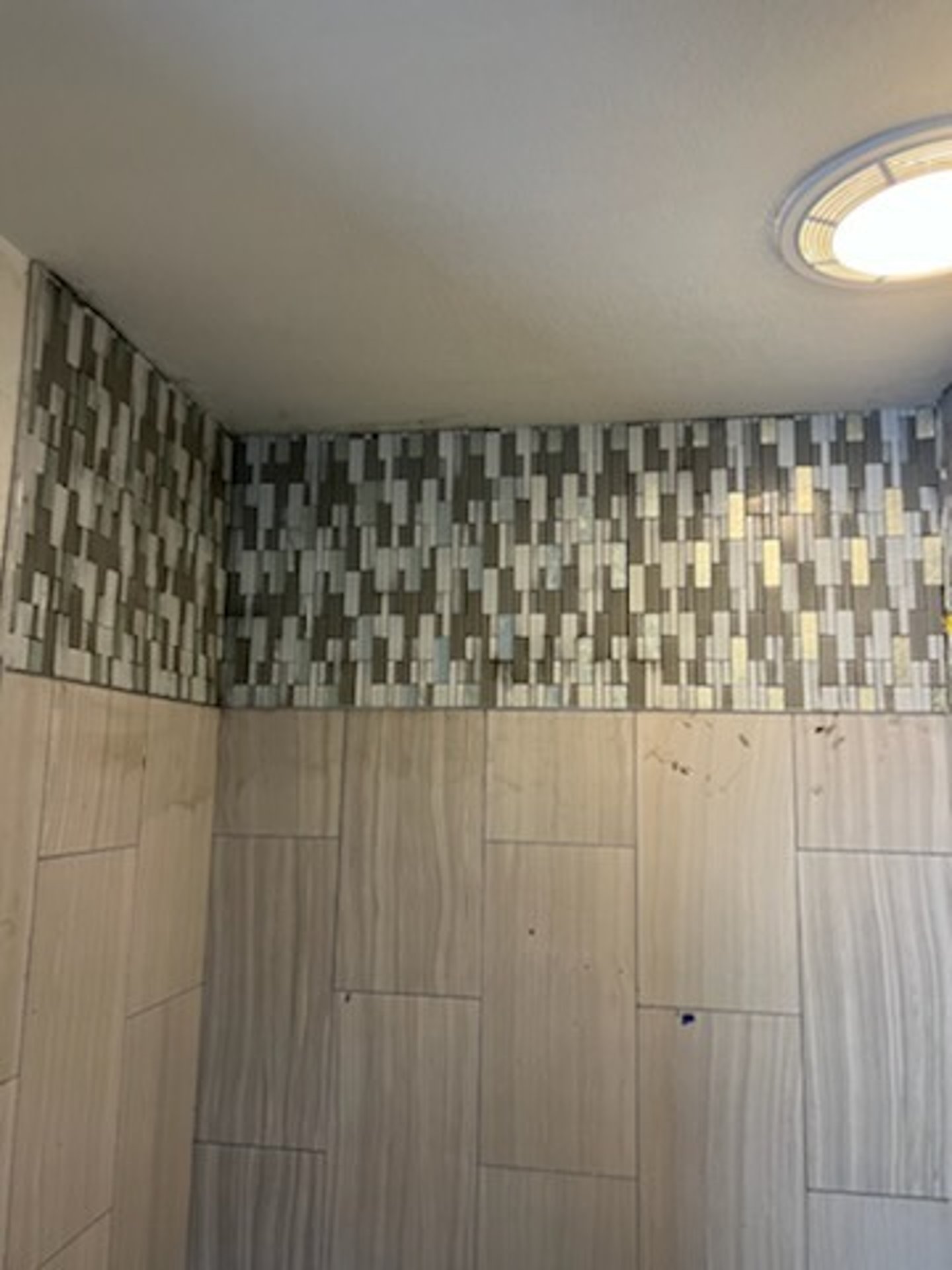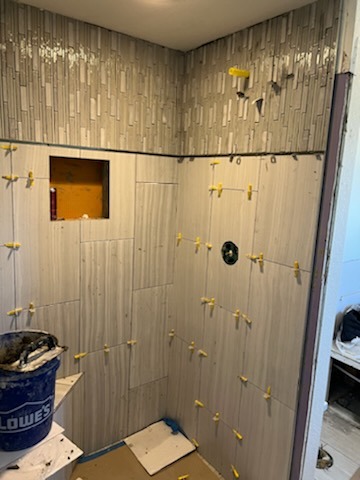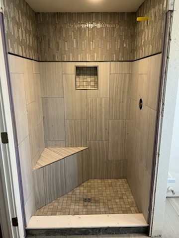 Bathroom shower renovation featuring newly installed tile and upgraded fixtures, highlighting both the transformation process and the finished result.