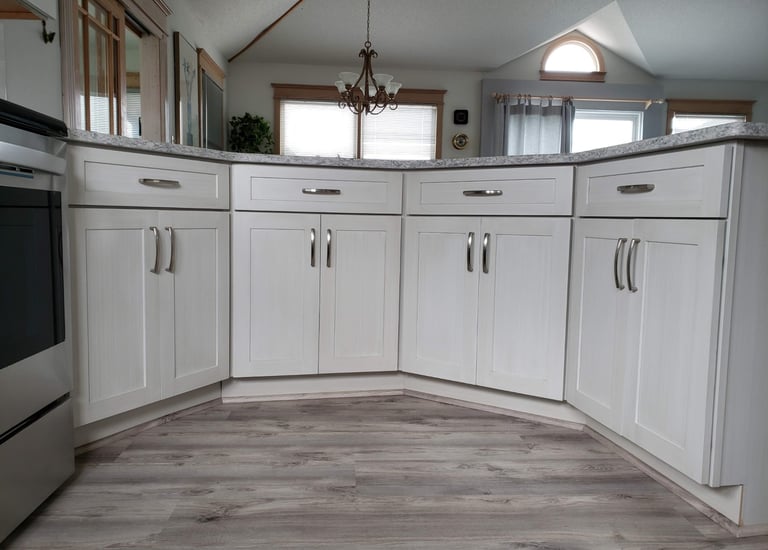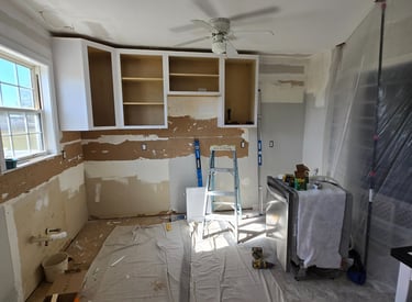 Kitchen renovation featuring newly installed cabinets and tile, showcasing both the transformation process and the completed result.